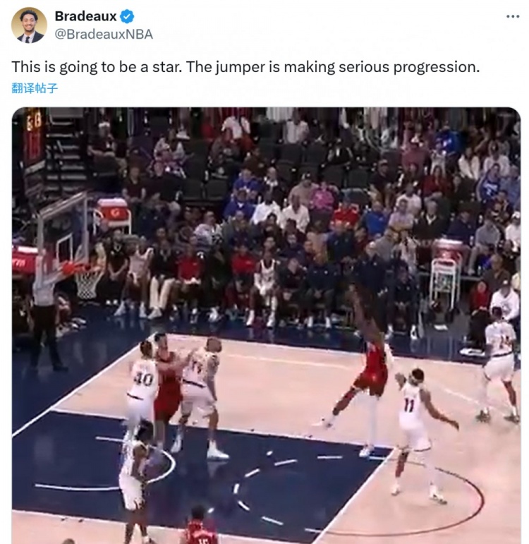 赛后火箭随队记者Bradeaux晒出阿门-汤普森的跳投视频,称赞道:“球星胚子,他的跳投进步太多了。”