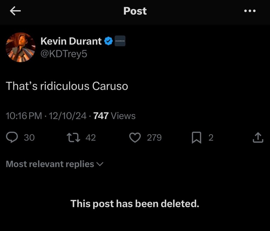 - 忘记切小号了?杜兰特发推赞叹卡鲁索又赶紧删了