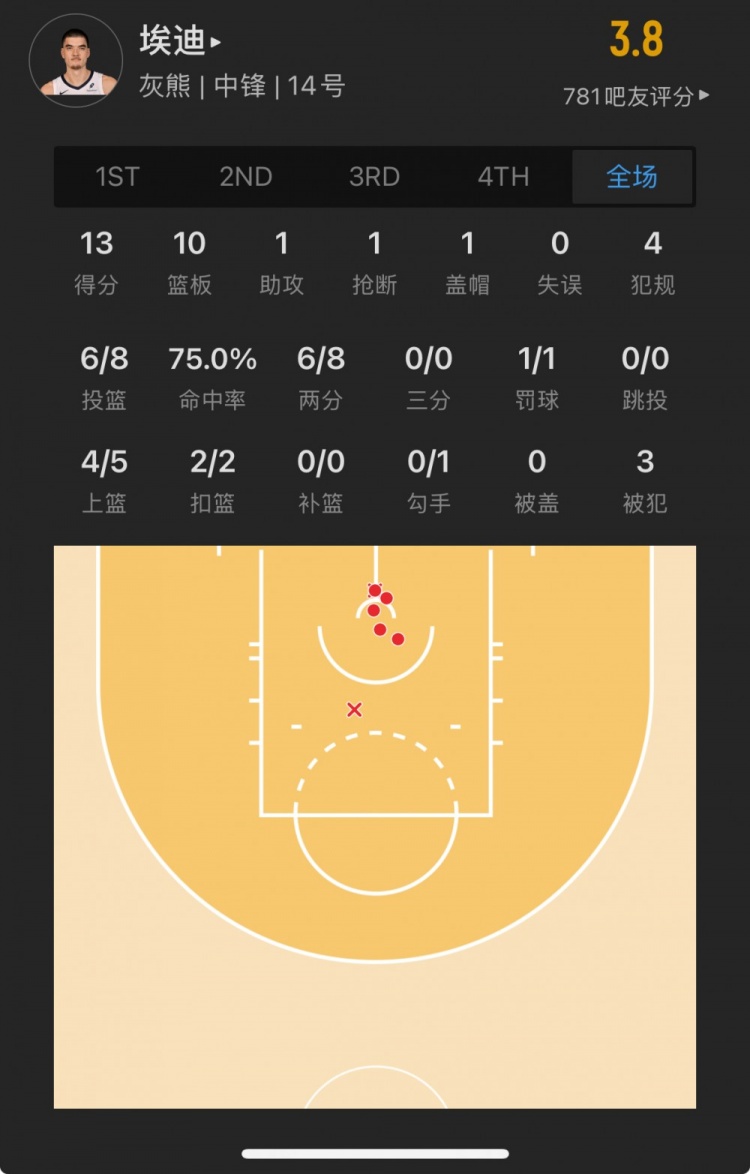 灰熊9号秀 扎克-埃迪 登场24.3分钟