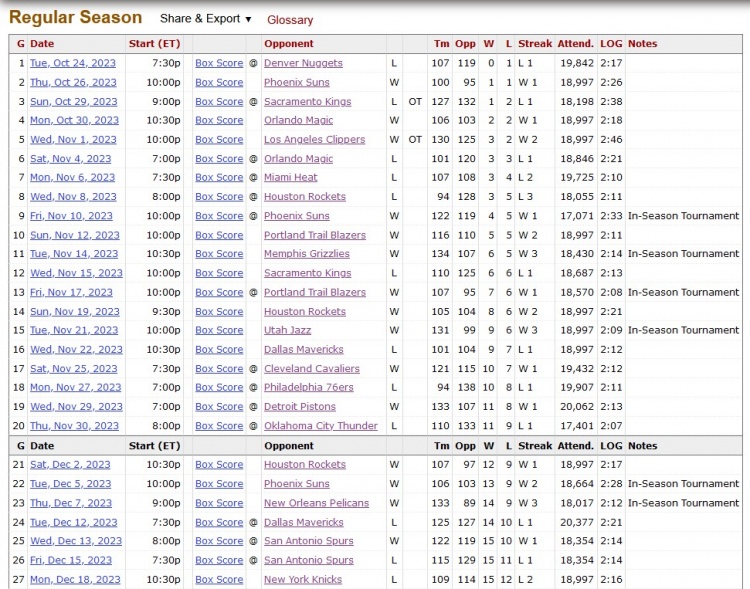 有意思的是,上赛季前27场比赛,湖人的战绩同样为15胜12负。
