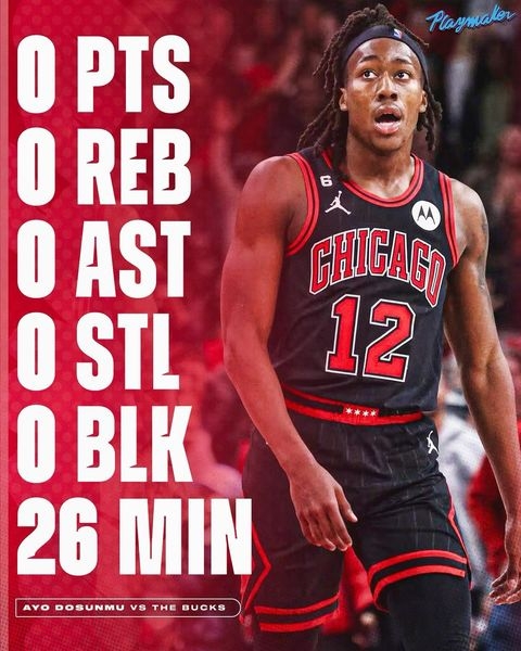 3、阿约-道苏姆,2023年12月11日,公牛129-133雄鹿,出场26分钟,6投0中