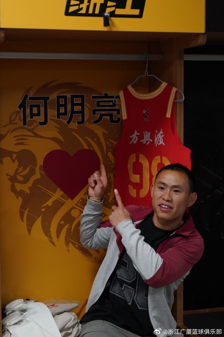 广厦队官博写道:“今天浙江广厦篮球俱乐部与篮球爱好者何明亮先生签订‘CBA球员一日合同’,赠予他专属98号球衣,邀请他现场观看浙江方兴渡主场比赛。