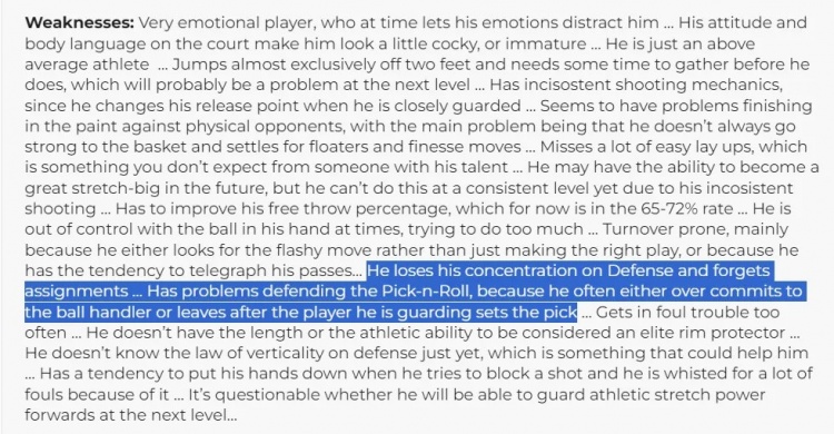 曾几何时,他还是只是个名不见经传的次轮总第43号秀,球探报告对他的评价是防守习惯差,在防守和篮板球方面都不够专注,身高和运动能力打前锋还行,但很难在五号位胜任保护篮筐的工作,在进攻端对篮筐的冲击不够强硬,在遇到对抗时总是喜欢做一些华而不实的动作,导致他在篮筐附近的终结不够稳定......