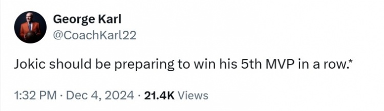 - 卡尔:约基奇应该准备好连续赢得他的第五个MVP了