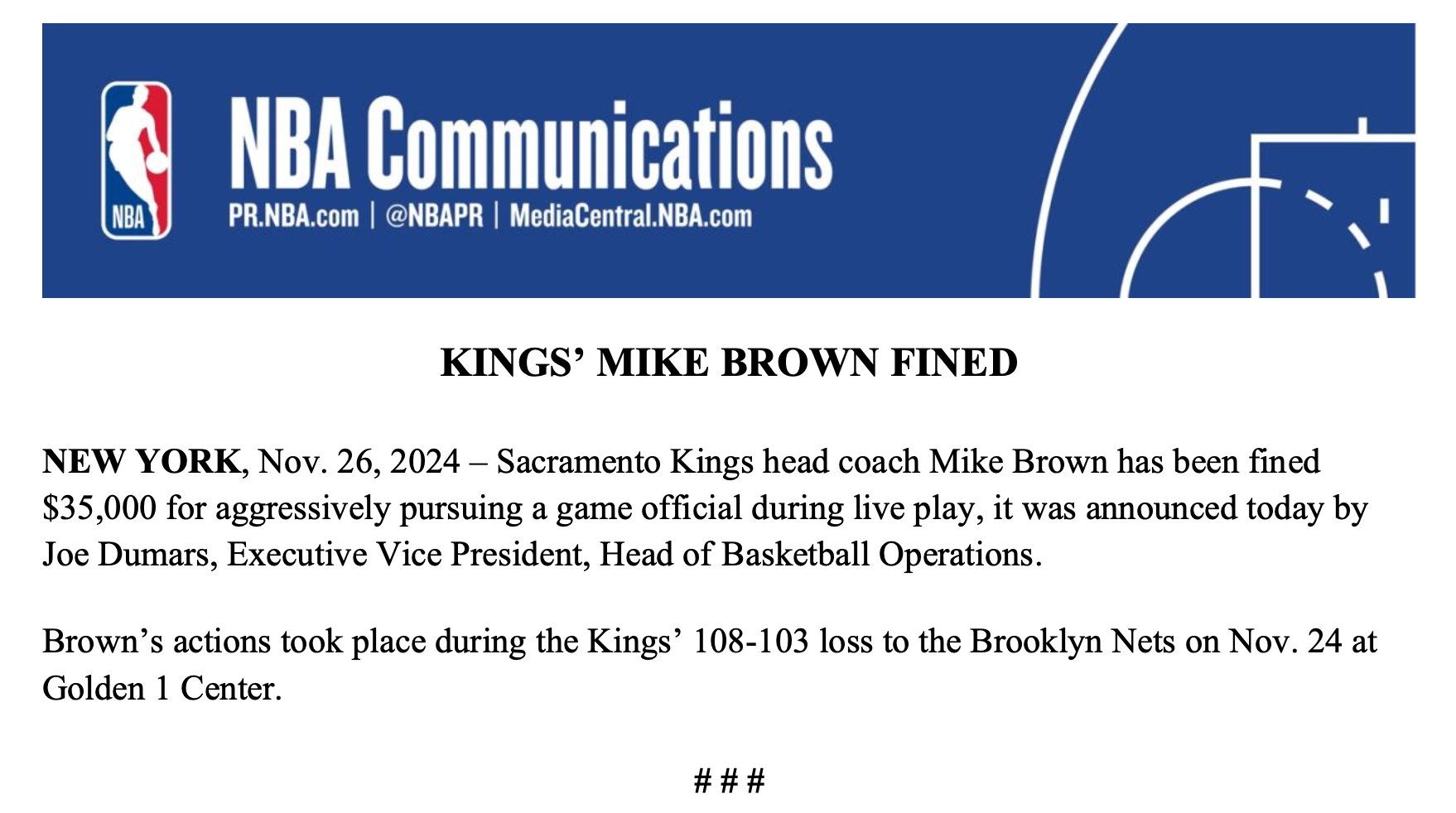 - NBA官方:国王主帅迈克-布朗因追着裁判抱怨吃T被罚35000美元