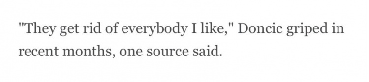 有消息称,独行侠曾经向另一支球队出售东契奇,试图得到想要的球员,但遭到拒绝。但队记方面对这一消息认为不可信——一方面,其他球队从未印证这一说法,而另一方面,“他从头到尾,只想要戴维斯一个人。”
