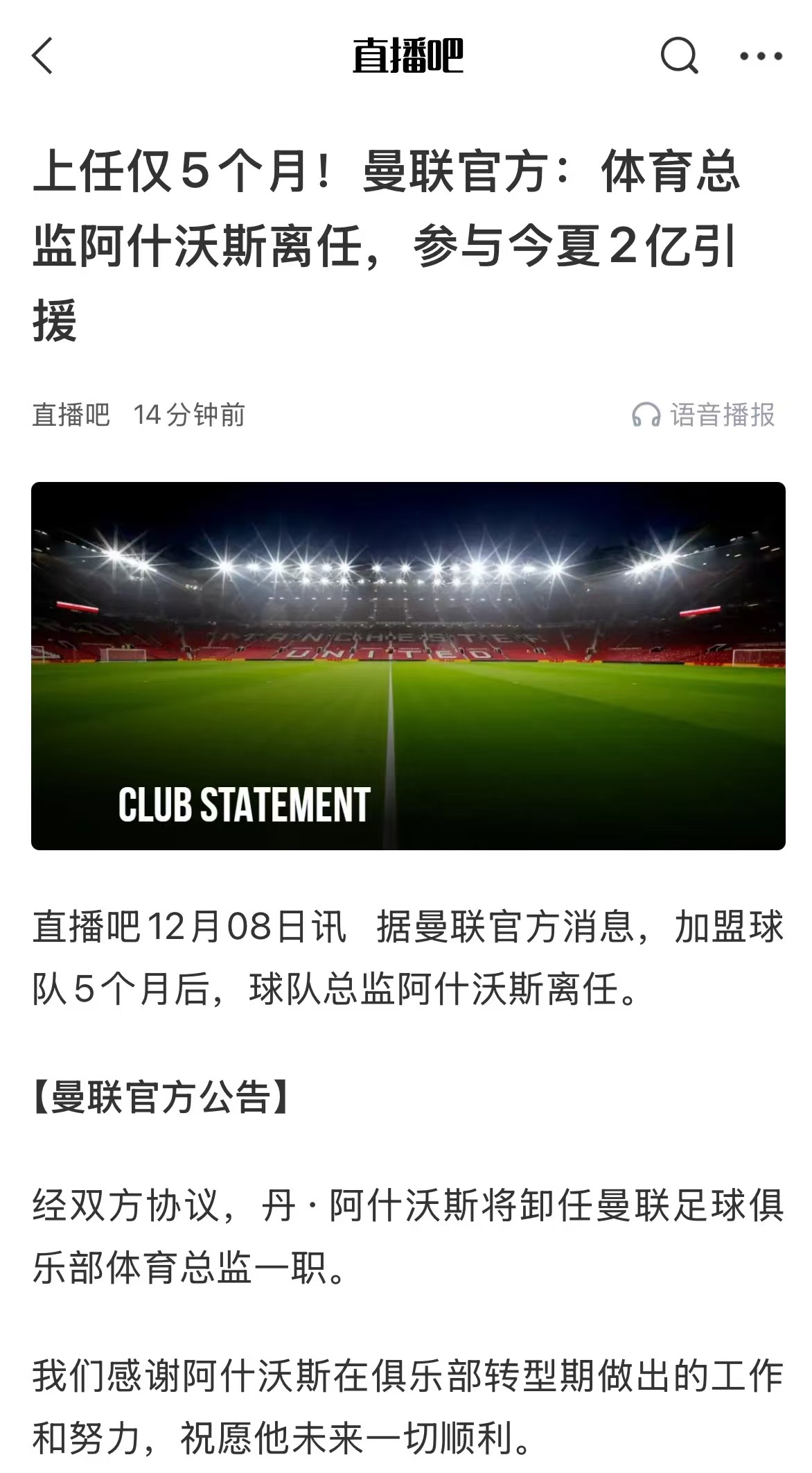 12月08日讯 据曼联官方消息,曼联总监阿什沃斯在上任5个月后离开球队,随着英力士入主曼联,今年球队多次操作引起球迷广泛讨论。