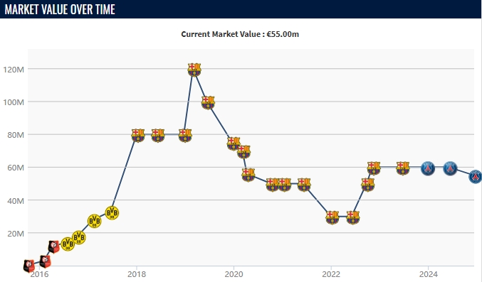 登贝莱职业生涯的巅峰身价为1.2亿欧,他在21岁效力巴萨时达到此身价。随后登贝莱因为表现太差,他的身价一路下跌至3000万欧,。2022年回升至6000万之后就一直没有再更新,直到本次降价。