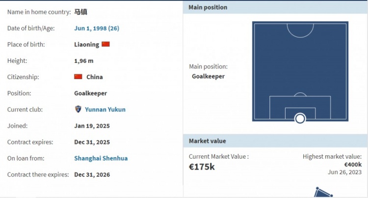 - 德转:云南玉昆租借上海申花门将马镇花费约200万人民币