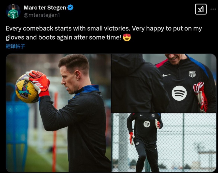 - 特尔施特根更新社媒,庆祝自己回到训练场