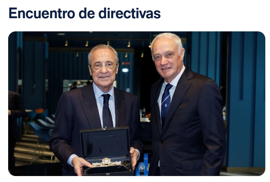 12月11日讯欧冠联赛阶段第6轮,皇马和亚特兰大交手。本场比赛之前,皇马主席弗洛伦蒂诺和亚特兰大主席佩尔卡西进行了会面并互赠礼物,两家俱乐部多名高层也有出席。
