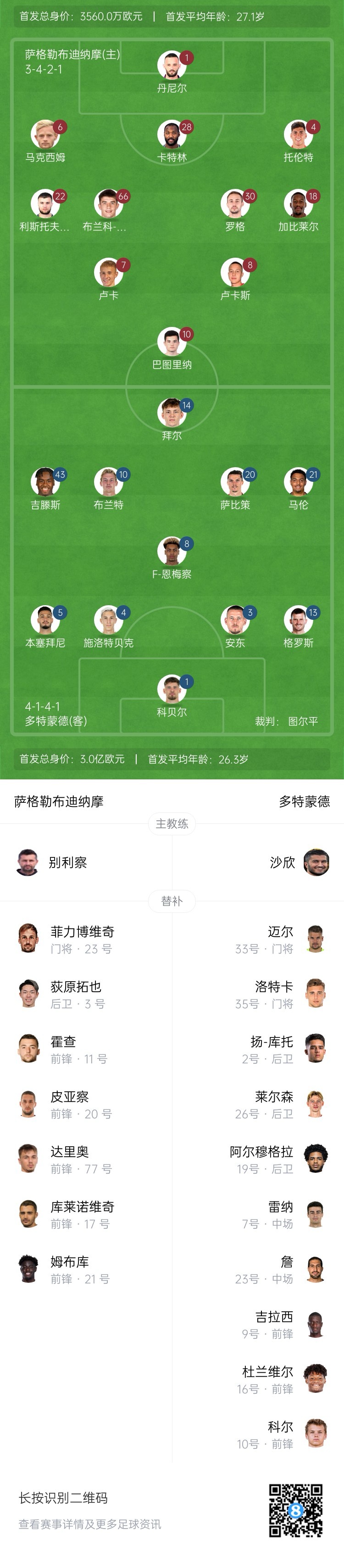 多特vs萨格勒布迪那摩首发:布兰特、吉滕斯、马伦先发