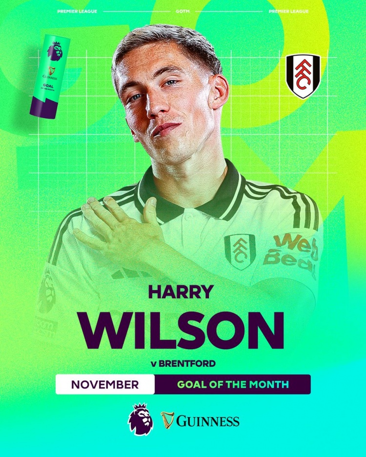 在英超第10轮比赛中,哈里-威尔逊补时阶段连进2球,帮助富勒姆主场2-1逆转布伦特福德,他的首粒进球是精彩的杂耍式破门,英超官方宣布这记脚后跟吊射当选11月最佳进球。