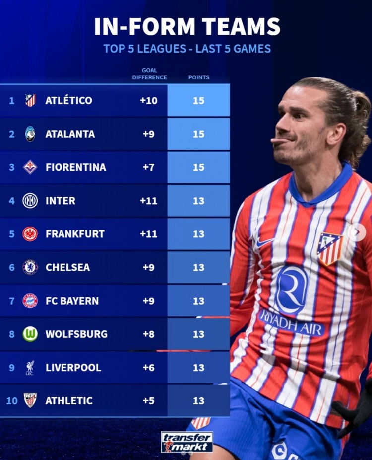 - 德转列五大联赛近五场状态榜:马竞&亚特兰大&佛罗伦萨5连胜最佳