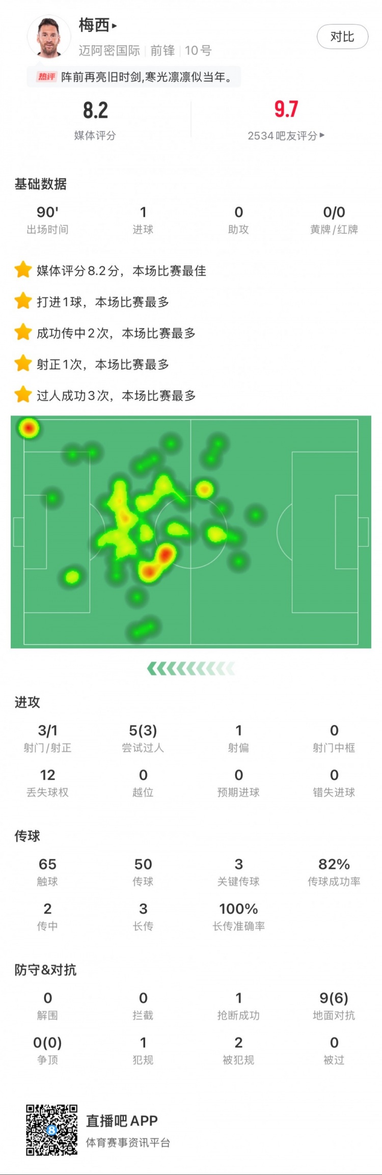 - 梅西本场数据:进1球,3次射门,3次关键传球,3次成功过人