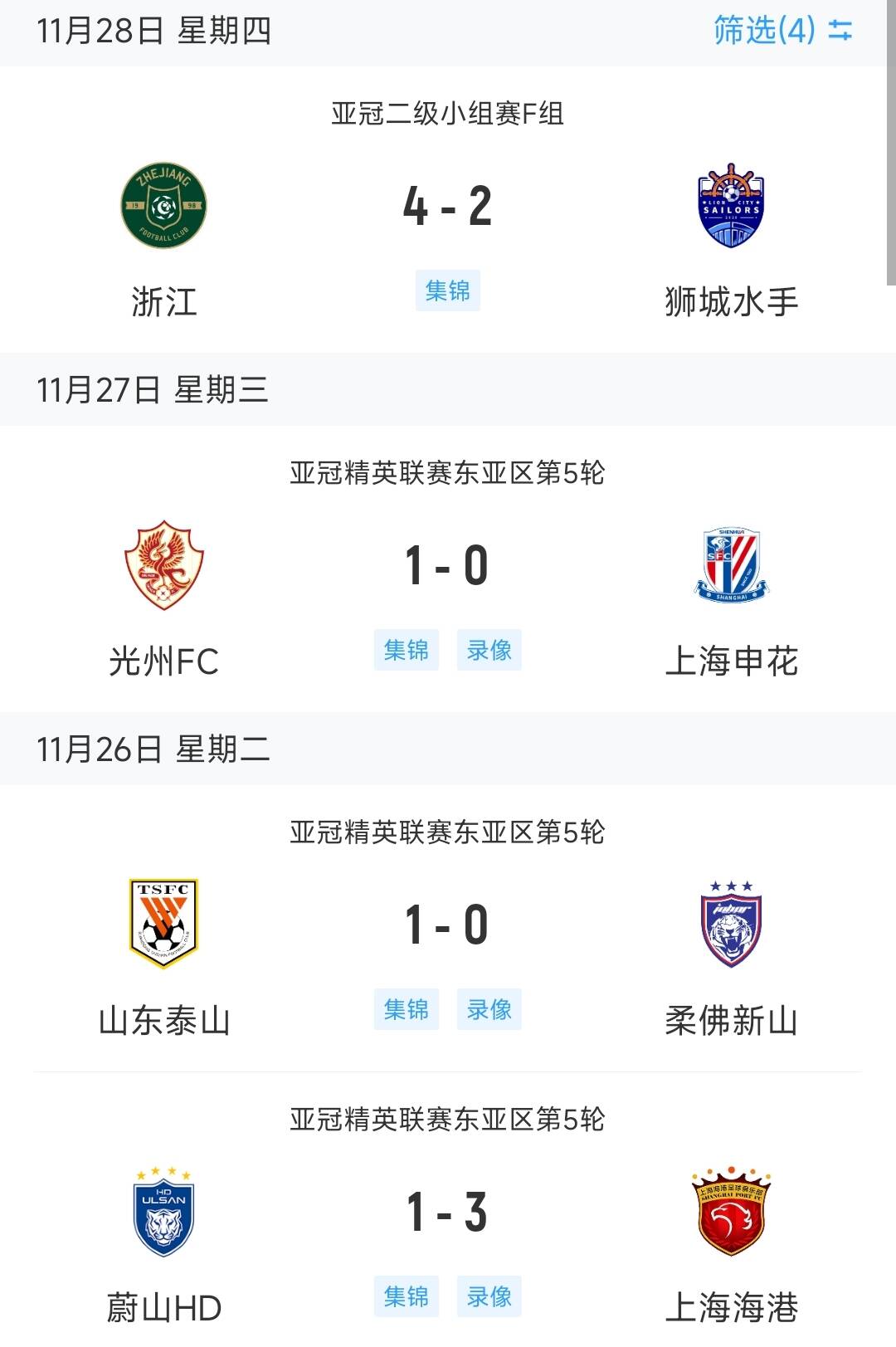 - 3胜1负!中超四队本轮亚冠战绩:浙江海港泰山均取胜,仅申花输球