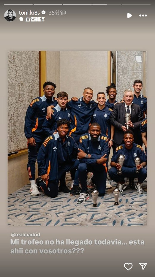 克罗斯晒皇马合照:我的FIFA最佳阵奖杯没收到,是在你们那吗?