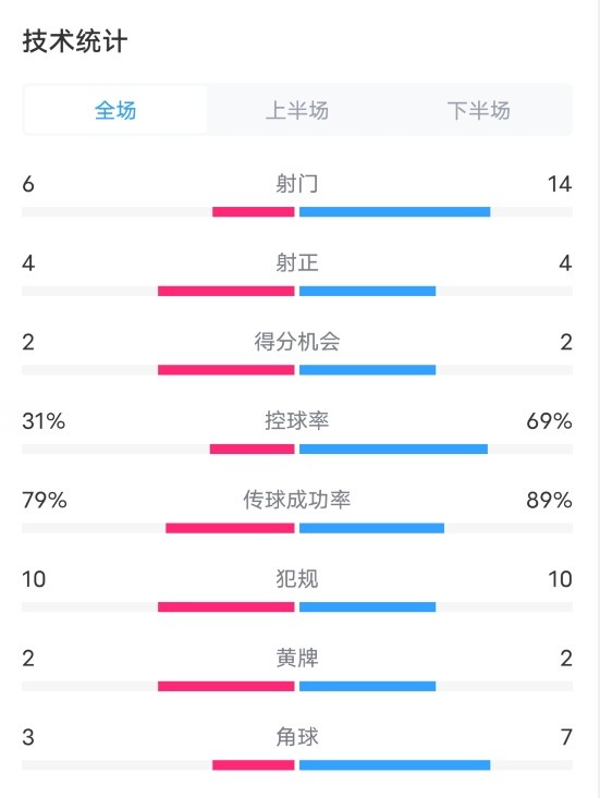 - 南安普顿1-2利物浦全场数据:射门6-14,射正4-4,控球率31%-69%