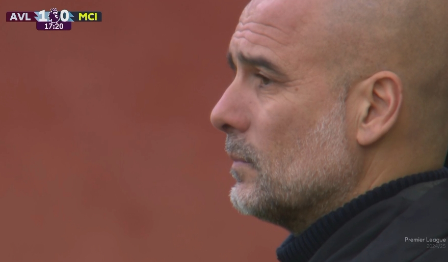 - 满脸无助目睹后防被打穿丢球,场边瓜迪奥拉愁眉苦脸略带哭相