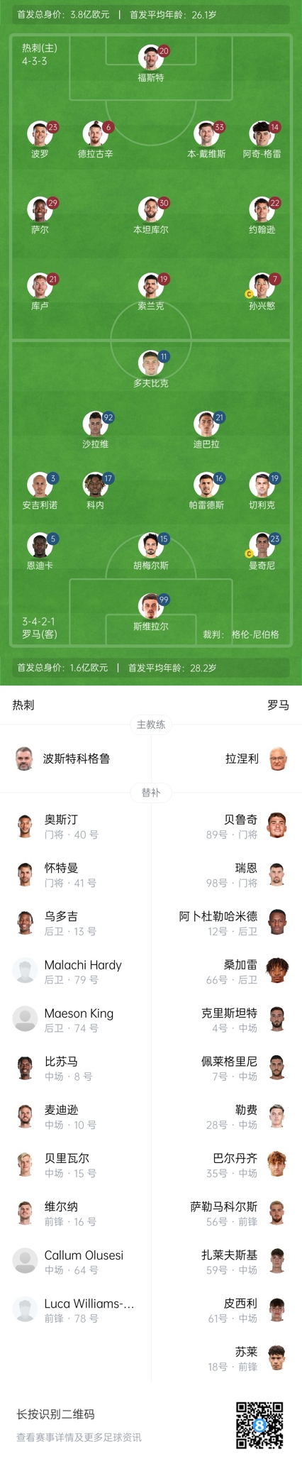 热刺替补:40-奥斯汀、41-坏特曼、8-比苏马、10-麦迪逊、13-乌多吉、15-伯格瓦尔、16-维尔纳、64-奥卢塞斯、74-金、78-巴内特、79-哈迪