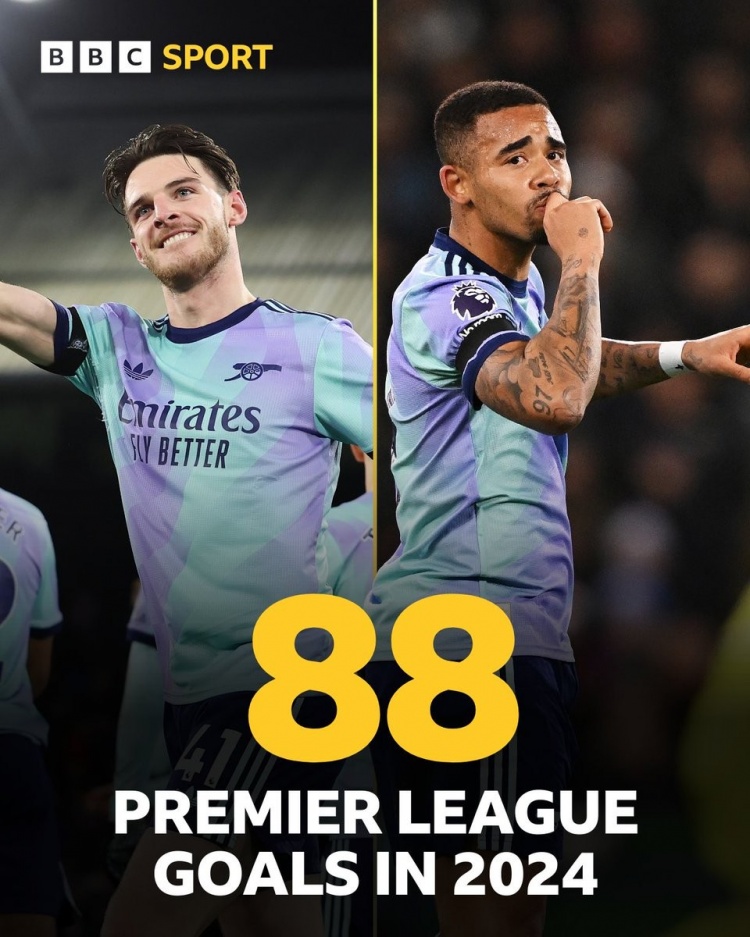 - 阿森纳2024年英超已进88球,刷新队史单一自然年英超进球纪录