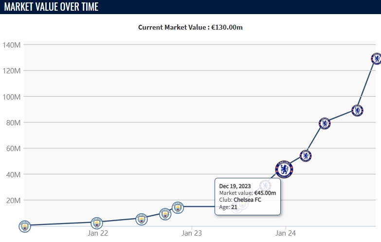 帕尔默在2023年德转最后一次更新时身价为4500万欧,随后在今年迎来连续四次上涨,目前达到1.3亿欧元。