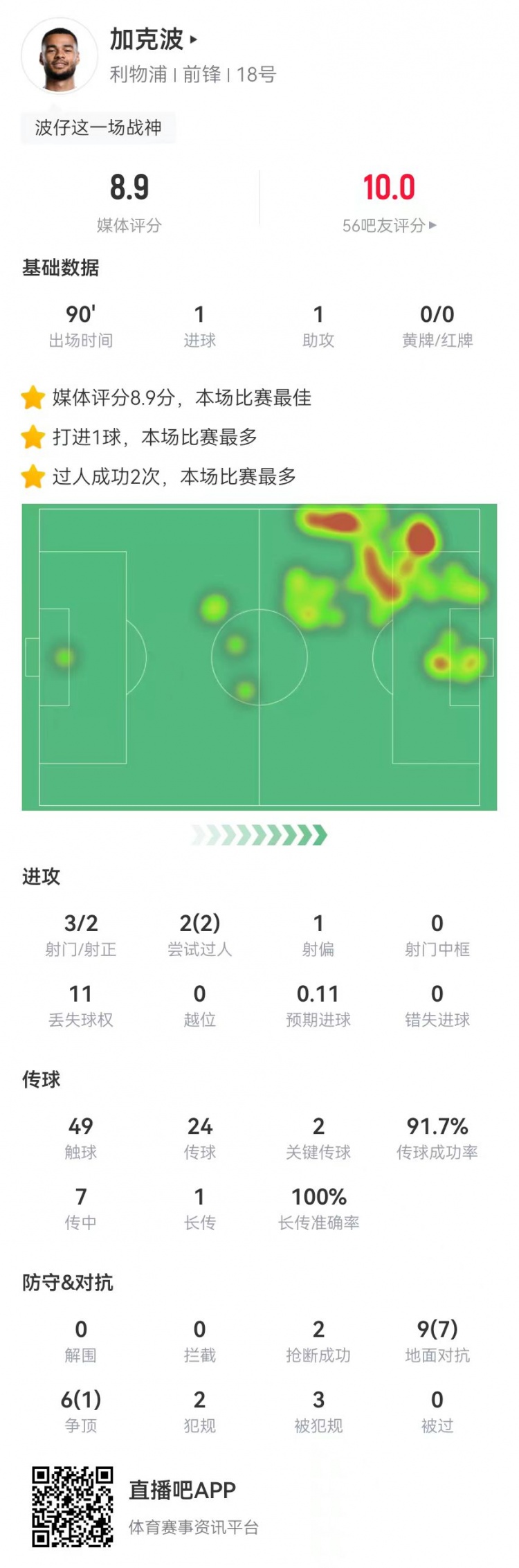 - 加克波本场3射2正进1球 1助攻+2关键传球 15对抗8成功+3造犯规