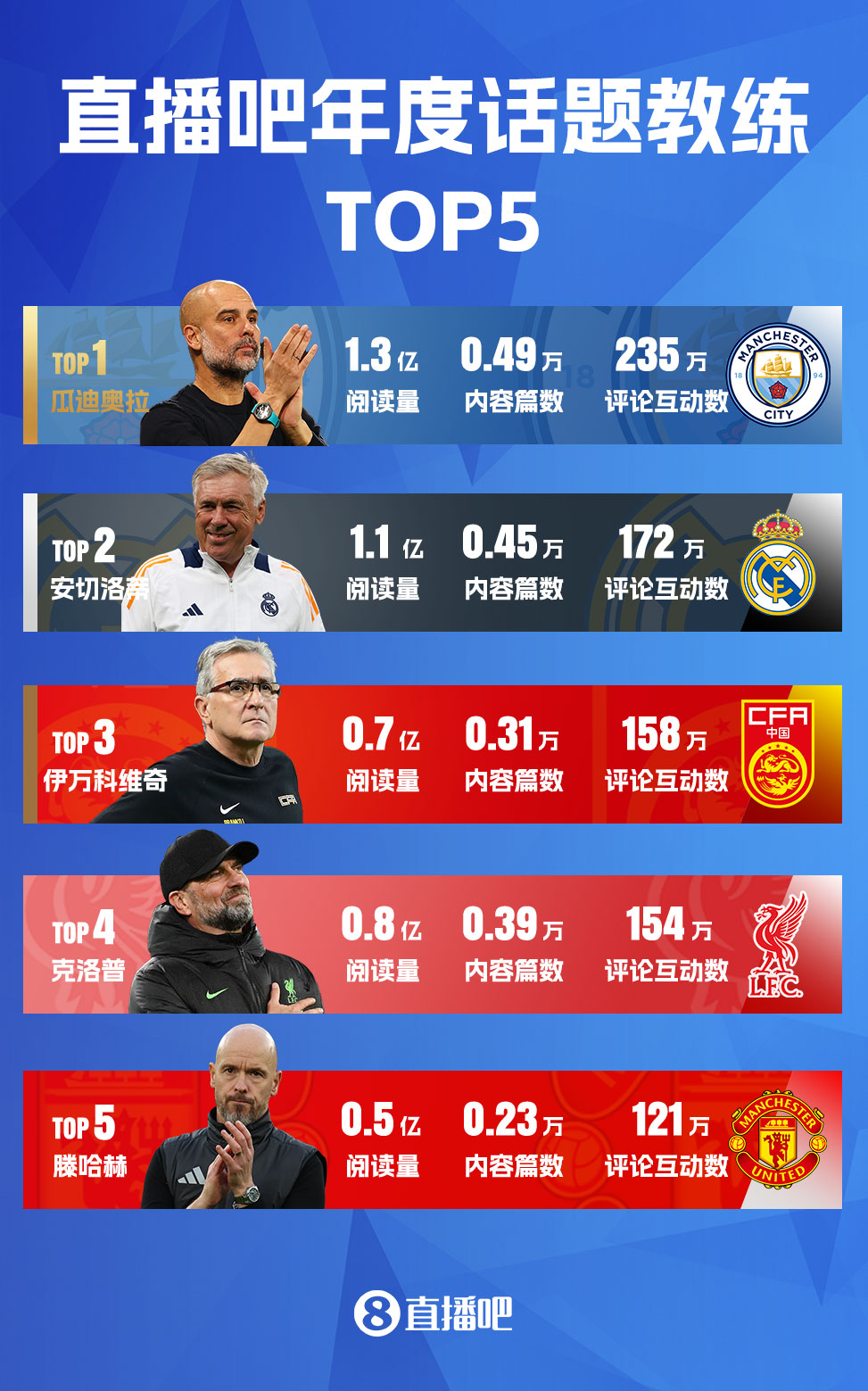 - 直播吧2024年度五大话题教练:瓜迪奥拉领衔,伊万、滕哈赫在列