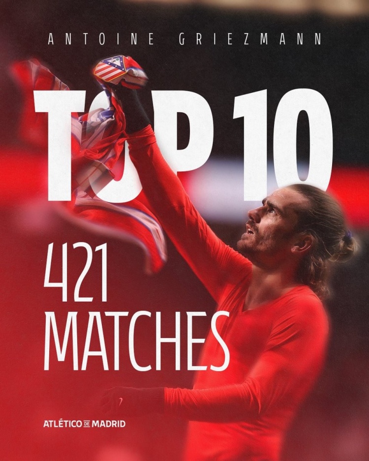 - 421场!格列兹曼跻身马竞队史出场榜前十,科克668场居首