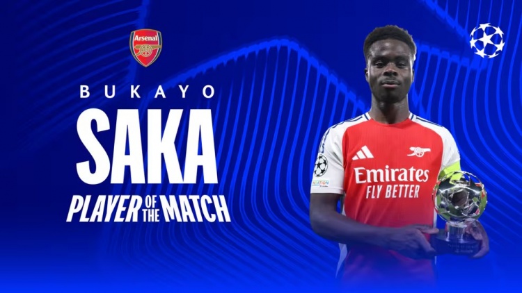 - 1球1助!萨卡当选阿森纳5-1葡体全场最佳球员