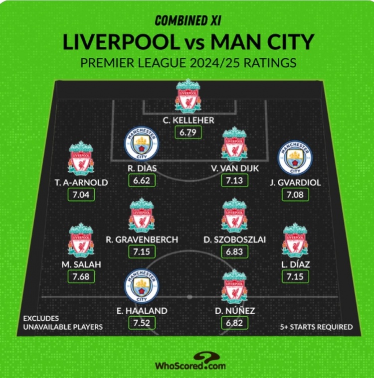 - Whoscored列利物浦&曼城本赛季评分最高阵:萨拉赫领衔红军8人