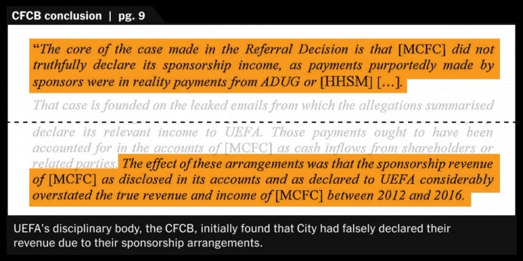 最初,欧足联裁决庭认定曼城违规,该裁决庭表示,曼城“没有如实申报他们的赞助收入,因为据称有赞助商支付的款项,实际上是来自阿布扎比或者曼苏尔”。