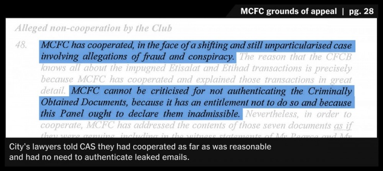 曼城向CAS提出了上诉,声称他们不必对泄露的邮件进行身份验证,并认为它们超出了审查小组的需要。