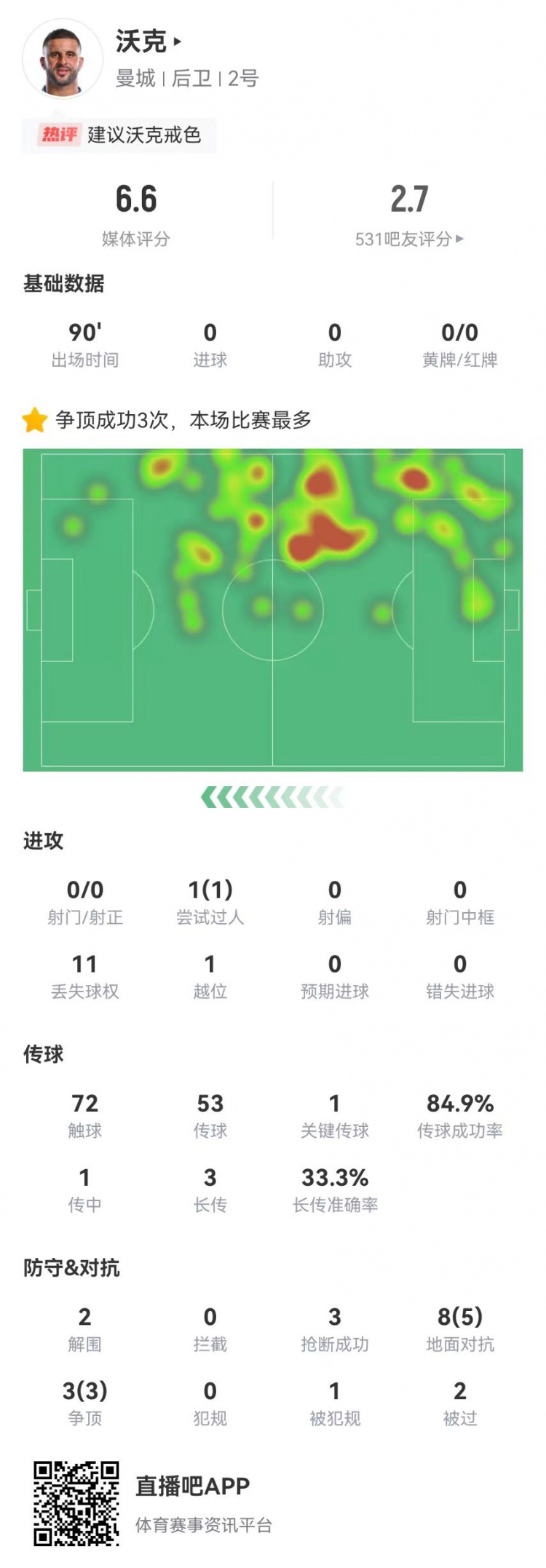 - 沃克本场2解围3抢断2被过+1失误导致射门 11对抗8成功 获评6.6分