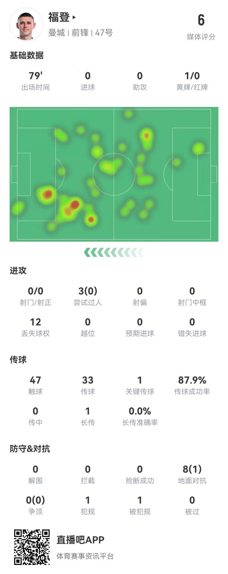 - 福登本场0射门+1关键传球 3过人0成功 8对抗1成功 获评6.0分