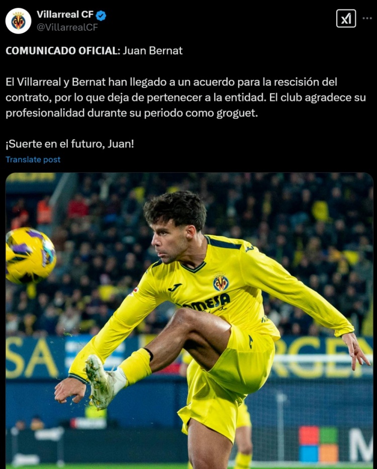 - 官方:比利亚雷亚尔和贝尔纳特提前终止租借合同,球员恢复自由身