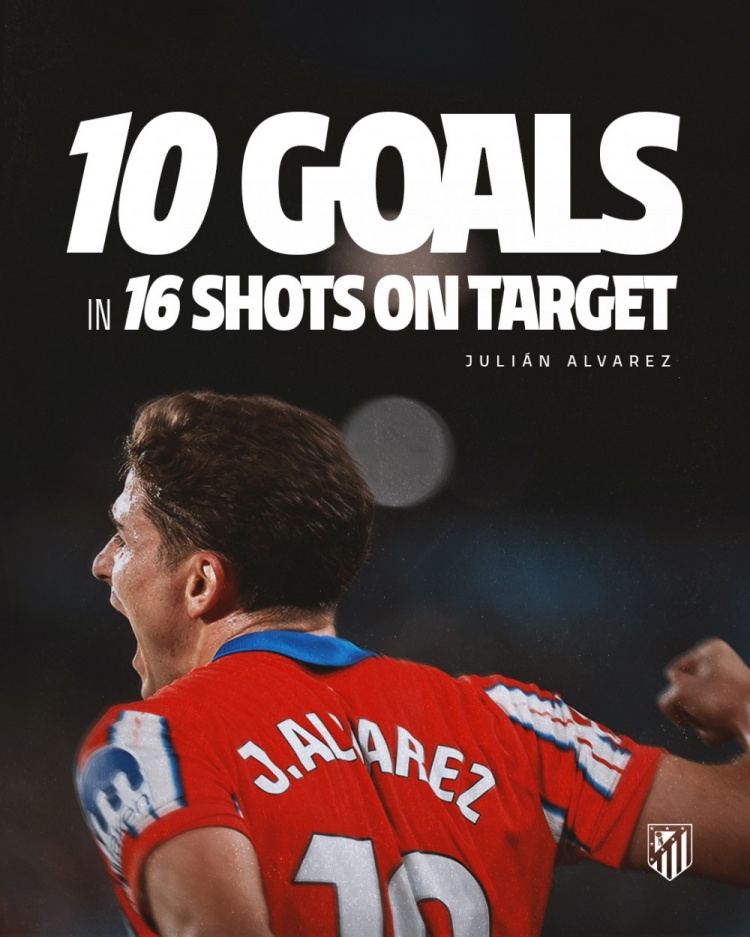 马竞官方社媒晒出了阿尔瓦雷斯本赛季的数据,他出战21场比赛,射正16次,攻入10粒进球,另外还有2次助攻。