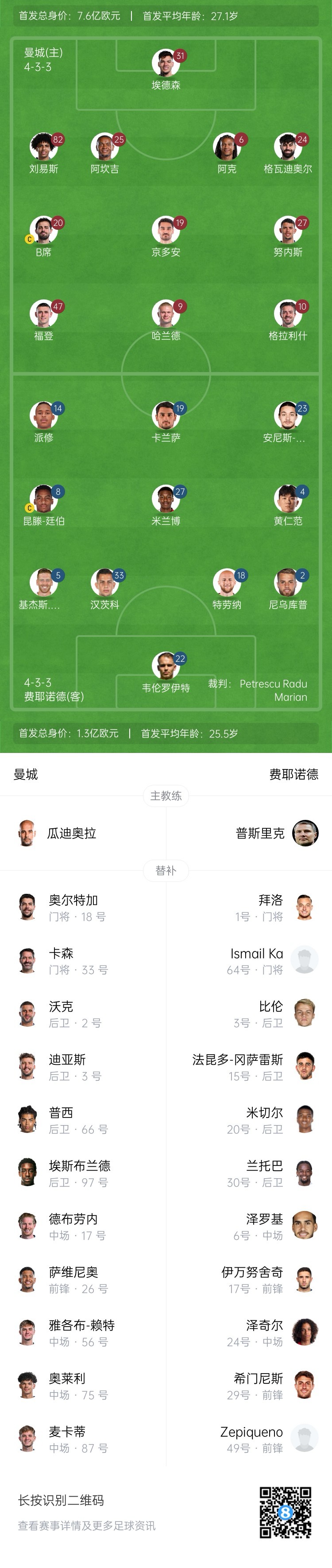曼城首发:31-埃德森、82-刘易斯、25-阿坎吉、6-阿克、24-格瓦迪奥尔、19-京多安、20-B席、27-努内斯、47-福登、10-格拉利什、9-哈兰德