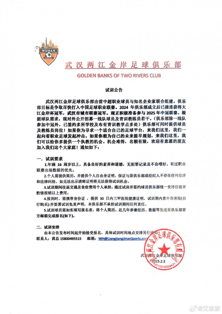 - 备战中冠,武汉两江金岸发试训公告:有职业联赛出场数据者优先