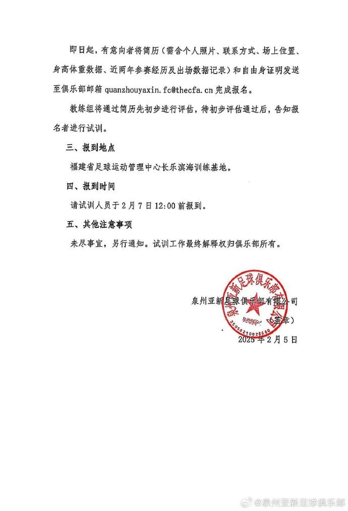 2月6日讯 中乙泉州亚新发布一线队试训公告,具备职业联赛经历的球员优先,并且要有自由身证明。
