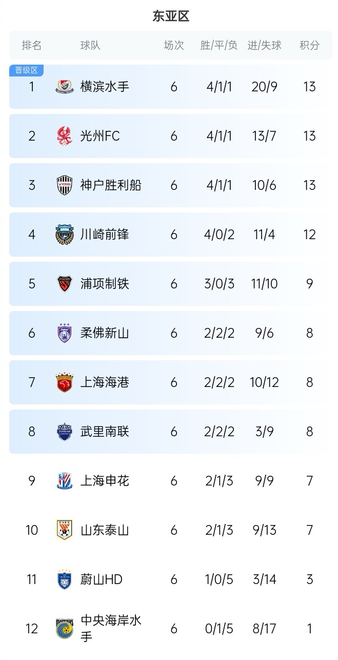 - 亚冠东亚区积分榜:申花、泰山均7分不在晋级区,海港8分暂第7
