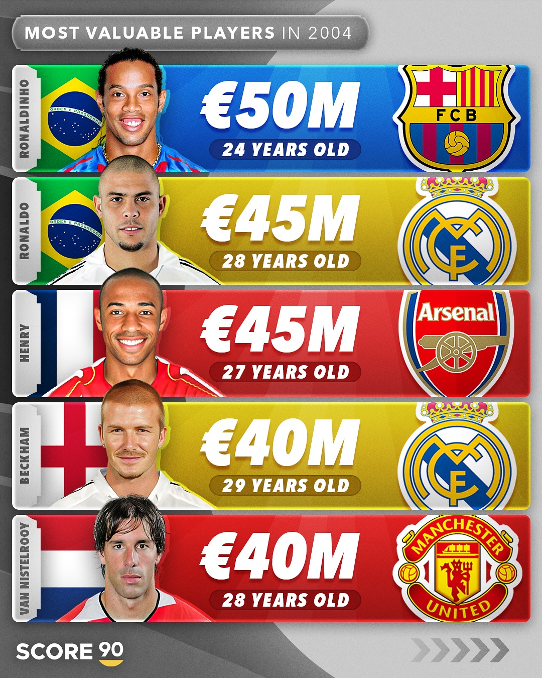- 翻4倍!20年前身价最高球员为小罗5000万欧,如今两人并列2亿