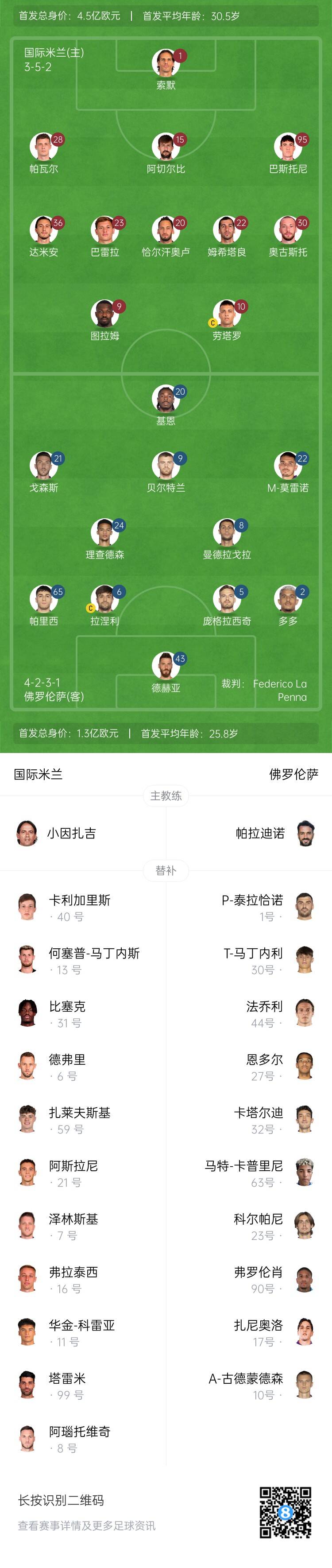 国米替补:13-何塞普-马丁内斯、40-卡利加里斯、6-德弗里、7-泽林斯基、8-阿瑙托维奇、11-华金-科雷亚、16-弗拉泰西、21-阿斯拉尼、31-比塞克、59-扎莱夫斯基、99-塔雷米