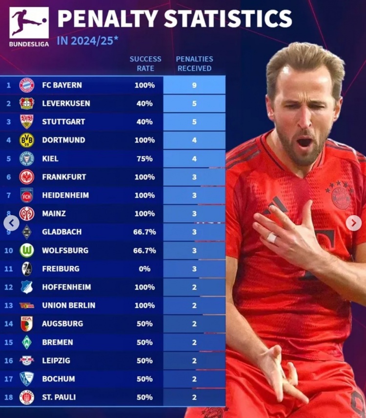 本赛季五大联赛获得点球情况:皇马10球、拜仁9球、利物浦6球