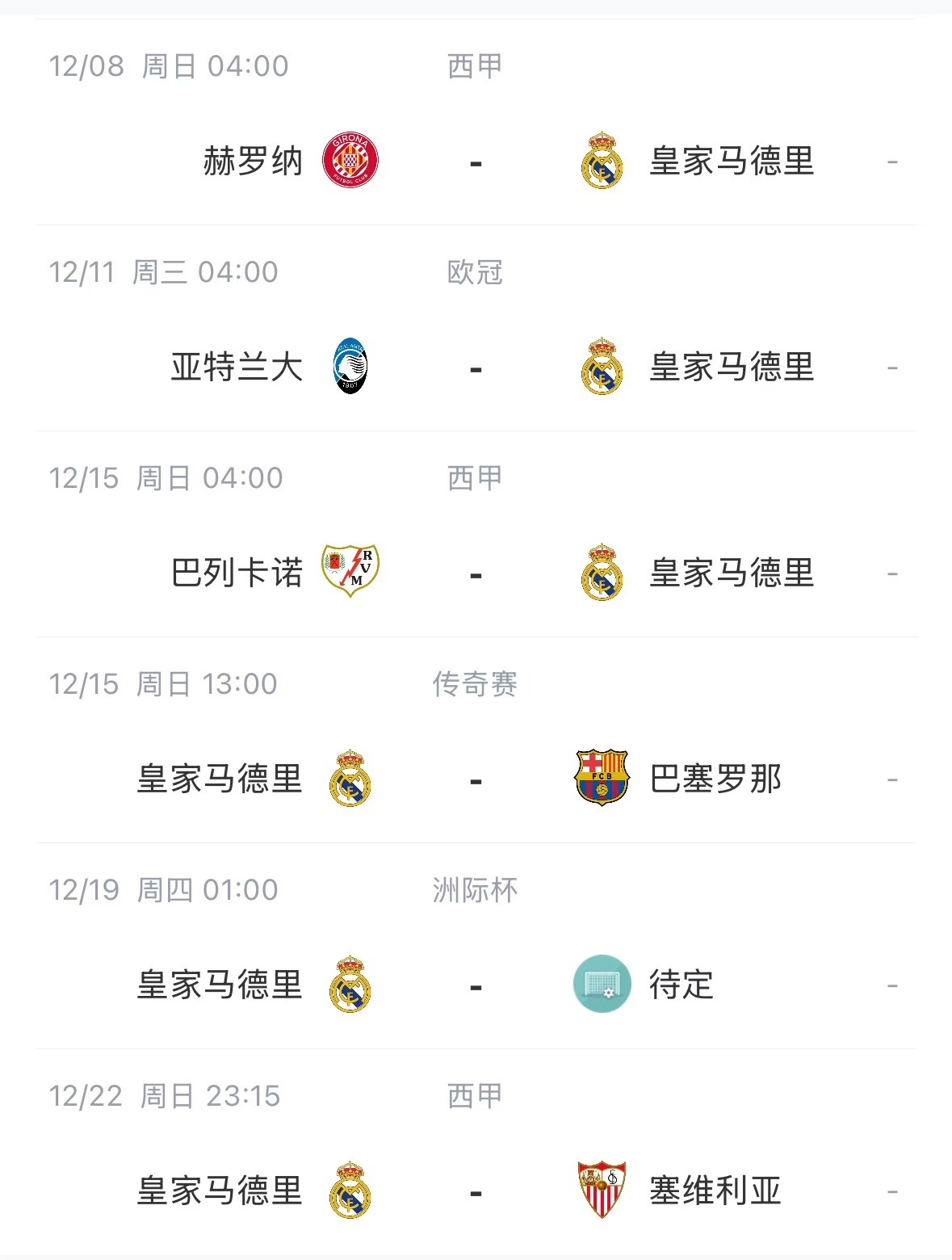 皇马本月剩余赛程: