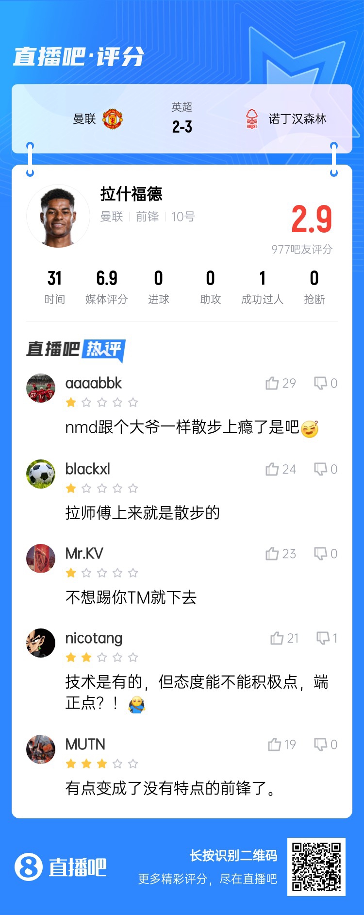 赛后,球迷再次怒批拉什福德的态度问题,吧友们为他打出了2.9分的超低分。