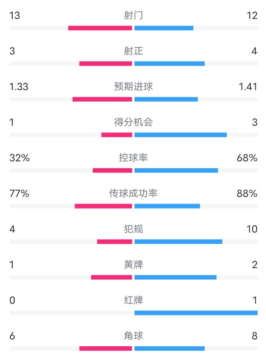 - 水晶宫2-2曼城全场数据:射门13-12,射正3-4,控球率32%-68%